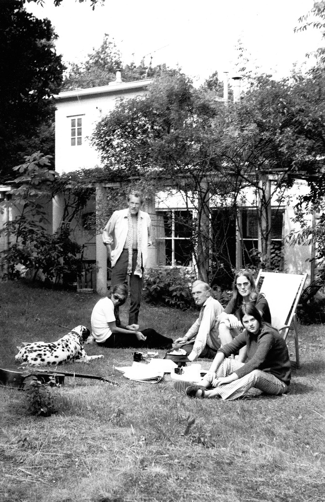 In tuin bij atelierwoning in Groet, met hond Geisha, Noor Bons-Dekker, Jan Bons, Elly de Waard en haar nichtje Annet (1971)