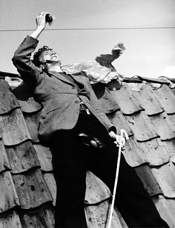 Van Geel staande op het dak van het huis van zijn grootvader: surrealistische installatie (1938)